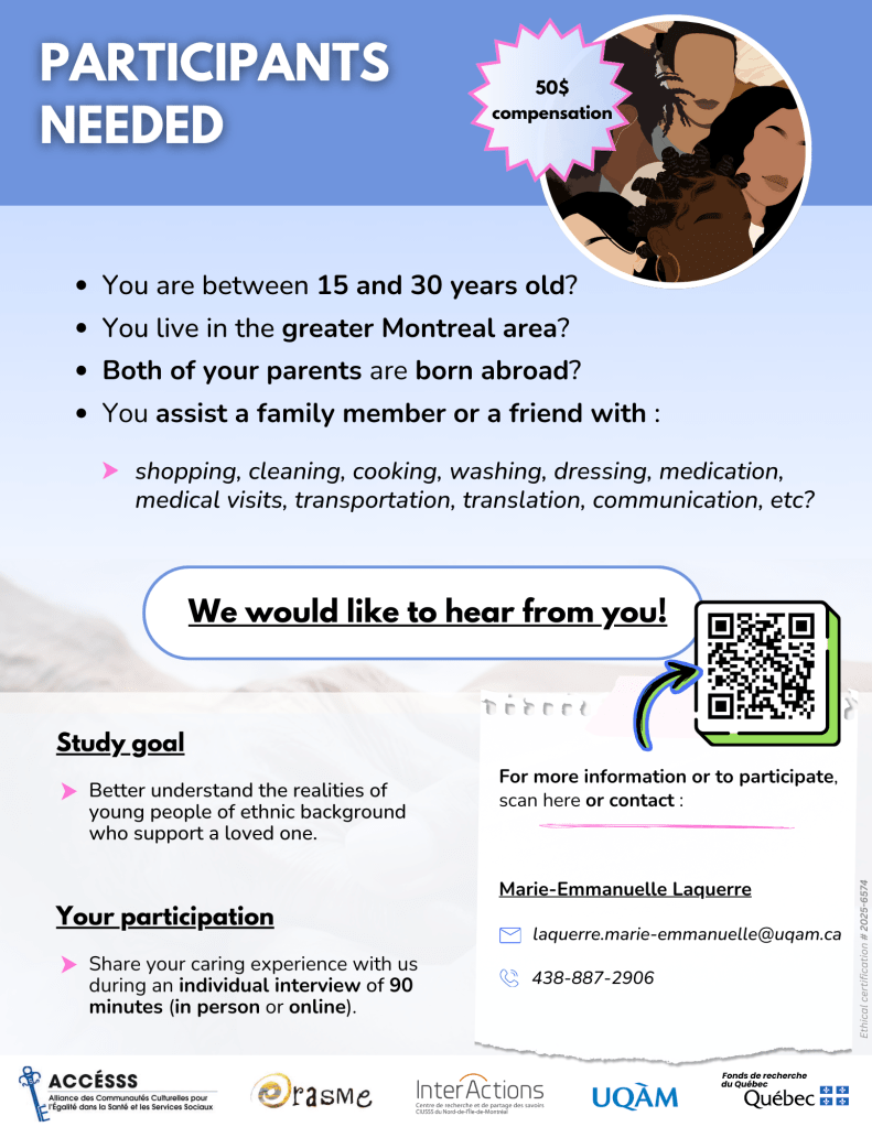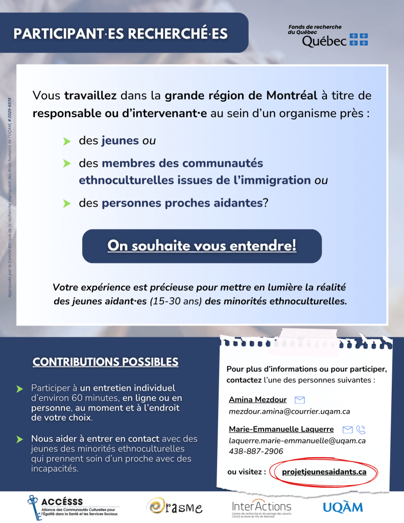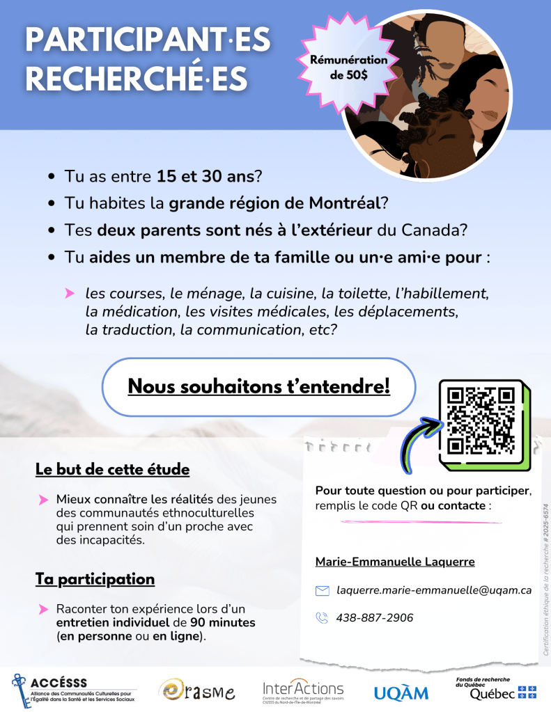 Cette étude porte sur les jeunes (15-30 ans) des communautés ethnoculturelles minoritaires qui prennent régulièrement soin d’une personne de leur entourage (membre de la famille, ami·e) ayant des incapacités physiques/intellectuelles ou rencontrant des enjeux de santé quotidiens.